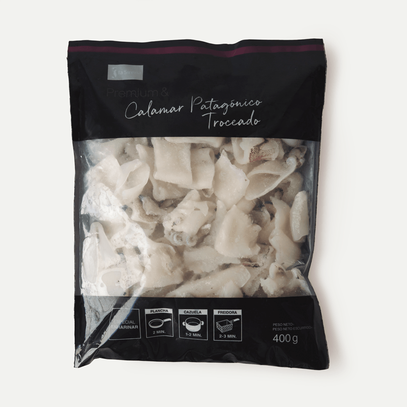 Calamar Patagònic trossejat, de textura tendra i sabor delicat. Ideal per preparar plats de marisc autèntics i saborosos. Perfecte per a receptes gurmet a casa. Compra calamars de qualitat superior a La Sirena!